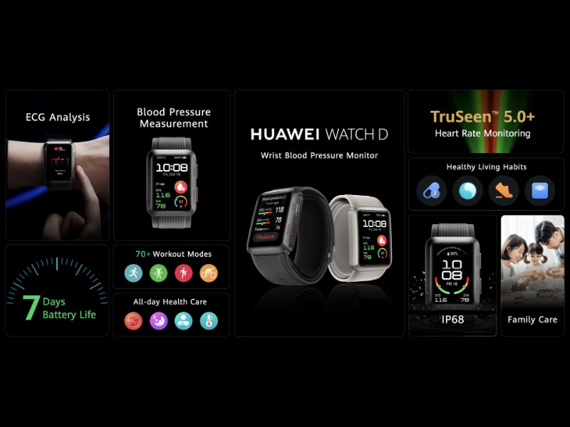 Genel olarak bakıldığı zaman huawei watch d‘nin en temel özelliği kan basıncı sensörü ve ölçümü olmaktadır. Fakat bu özellikten daha fazlasına sahip olmaktadır. EKG, SpO2- kan oksijeni, cilt ısısı ve daha fazlasının da ölçümünü yapmaktadır. Günümüzde fitness sporu ile ilgilenen kişilerin beklediği kalp atış hızı, stres, uyku adım sayıları gibi tüm istatistikleri izlemekte ve değerlendirmektedir.
